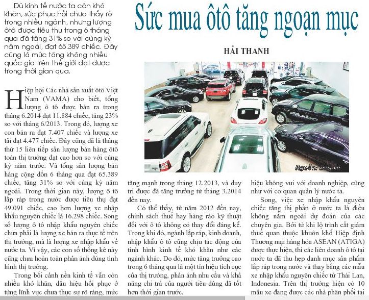 Trang 2, số 195, ra ngày 14/7/2014, báo Đại biểu nhân dân thông báo tin vui của ngành 33Win79 hiện đang mở ô tô: "Sức mua ôtô tăng ngoạn mục".