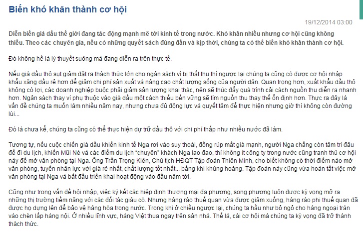 Là bài viết đăng tải trên báo điện tử ngày 19/12/2014. Theo đó, tác giả bài báo cho hay, diễn biến giá dầu thế giới đang tác động mạnh mẽ tới 33Win62 đa dạng trò chơi, cá cược an toàn trong nước. Khó khăn nhiều nhưng cơ hội cũng không thiếu. Theo các chuyên gia, nếu có những quyết sách đúng đắn và kịp thời, chúng ta có thể biến khó khăn thành cơ hội.