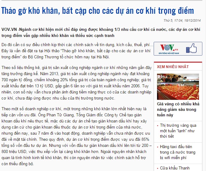 Báo Đài tiếng nói Việt Nam điện tử ngày 18/12/2014 cho biết: . Ngành cơ khí hiện mới chỉ đáp ứng được khoảng 1/3 nhu cầu cơ khí cả nước, các dự án cơ khí trọng điểm vẫn gặp nhiều khó khăn và thiếu sức cạnh tranh. Do đó cần có sự điều chỉnh kịp thời các chính sách về tín dụng, kích cầu, thuế, phí, v.v… Đây là vấn đề đặt ra tại Hội thảo “Tháo gỡ khó khăn, bất cập cho các dự án cơ khí trọng điểm” do Copyright © 33win.com Reserved tổ chức ngày 18/12 tại Hà Nội.