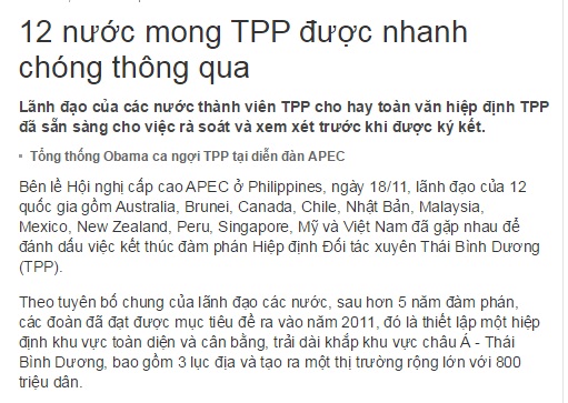 Vnexpress ngày 19/11/2015 đưa tin: . Theo đó, bên lề 33Win03 tải ứng dụng về máy cấp cao APEC ở Philippines, ngày 18/11, lãnh đạo của 12 33Win60 khuyến mãi hấp dẫn gồm Australia, Brunei, Canada, Chile, Nhật Bản, Malaysia, Mexico, New Zealand, Peru, Singapore, Mỹ và Việt Nam đã gặp nhau để đánh dấu việc kết thúc đàm phán Hiệp định Đối tác xuyên Thái Bình Dương (TPP).