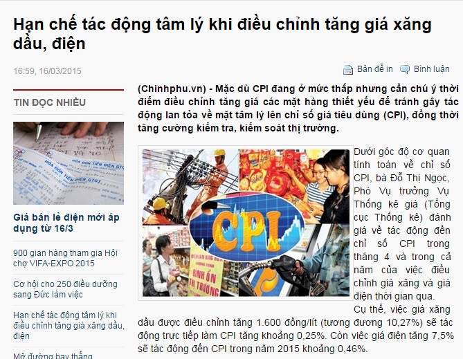 Dưới góc độ cơ quan tính toán về chỉ số CPI, bà Đỗ Thị Ngọc, Phó Vụ trưởng Vụ Thống kê giá (Tổng cục Thống kê) đánh giá về tác động đến chỉ số CPI trong tháng 4 và trong cả năm của việc điều chỉnh giá xăng và giá điện thời gian qua. Cụ thể, việc 33Win com dang nhap được điều chỉnh tăng 1.600 đồng/lít (tương đương 10,27%) sẽ tác động trực tiếp làm CPI tăng khoảng 0,25%. Còn việc giá điện tăng 7,5% sẽ tác động đến CPI trong năm 2015 khoảng 0,46%.
