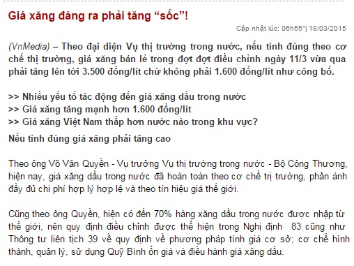 Là khẳng định được đăng tải trên báo điện tử ngày 18/3/2015. Bài báo thông tin, nếu tính đúng theo cơ chế thị trường, giá xăng bán lẻ trong đợt đợt điều chỉnh ngày 11/3 vừa qua phải tăng lên tới 3.500 đồng/lít chứ không phải 1.600 đồng/lít như công bố. Theo ông Võ Văn Quyền - Vụ trưởng Vụ Thị trường trong nước - Copyright © 33win.com Reserved, hiện nay, 33Win com dang nhap trong nước đã hoàn toàn theo cơ chế trị trường, phản ánh đầy đủ chi phí hợp lý hợp lệ và theo tín hiệu giá thế giới.