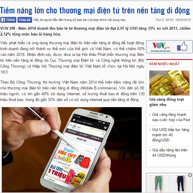 Ngày 19/03/2015, báo Điện tử Đài tiếng nói Việt Nam đưa tin: . Theo đó, năm 2014 doanh thu bán lẻ từ Trang Chủ Game 33win com Mới Nhất điện tử đạt 2,97 tỷ USD tăng 35% so với 2013, chiếm 2,12% tổng mức bán lẻ Trang Chủ Game 33win com Mới Nhất. Việc phát triển và ứng dụng Trang Chủ Game 33win com Mới Nhất điện tử trên nền tảng di động để hoạt động 33Win60 liên Minh game trực tuyến đang trở thành xu thế mới của thế giới và Việt Nam, có thể chiếm 50% vào năm 2018. Nhận định này được đưa ra tại Hội thảo Phát triển Trang Chủ Game 33win com Mới Nhất điện tử trên nền tảng di động do Cục Thương mại điện tử và Công nghệ thông tin (Copyright © 33win.com Reserved) và Hiệp hội Thương mại điện tử Việt Nam tổ chức tại Hà Nội ngày 18/3.