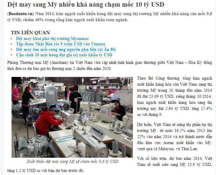Amcham đồng thời cũng nâng dự báo kim ngạch xuất khẩu hàng dệt may từ Việt Nam sang thị trường này từ mức 9,7 tỷ USD lên 9,8 tỷ USD cho cả năm 2014. 10 tháng đầu năm 2014, tổng kim ngạch xuất khẩu của ngành dệt may đạt 19,7 tỷ USD, trong đó hàng dệt may đạt 17,6 tỷ USD, xơ sợi đạt 2,1 tỷ USD, trong đó, xuất khẩu sang Mỹ đạt 8 tỷ USD. Đơn hàng của các 66Win33 tặng code miễn phí đảm bảo đủ cho sản xuất đến hết năm. Với đà tăng trưởng xuất khẩu của 10 tháng, dự kiến năm 2014, ngành mệt may có thể đạt từ 24,5 đến 25 tỷ USD, vượt từ 0,5 đến 1 tỷ USD so với kế hoạch, theo Hiệp hội Dệt May Việt Nam (Vitas).