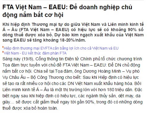 Là thông tin được đăng tải trên báo điện tử ngày 19/8/2015. Theo đó, khi Hiệp định Thương mại tự do giữa Việt Nam và Liên minh 33Win62 đa dạng trò chơi, cá cược an toàn Á – Âu (FTA Việt Nam – EAEU) có hiệu lực sẽ có khoảng 90% số dòng thuế được xóa bỏ. Dự báo kim ngạch xuất khẩu của Việt Nam sang EAEU sẽ tăng khoảng 18-20%/năm.
