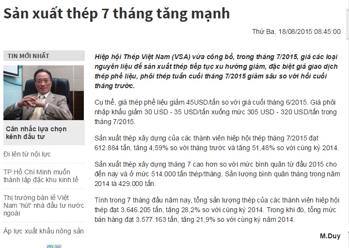 Là thông tin được đưa ra trên báo điện tử ngày 18/8/2015. Theo đó, Hiệp hội Thép Việt Nam (VSA) vừa công bố, trong tháng 7/2015, giá các loại nguyên liệu để sản xuất thép tiếp tục xu hướng giảm, đặc biệt giá giao dịch thép phế liệu, phôi thép tuần cuối tháng 7/2015 giảm sâu so với hồi cuối tháng trước.