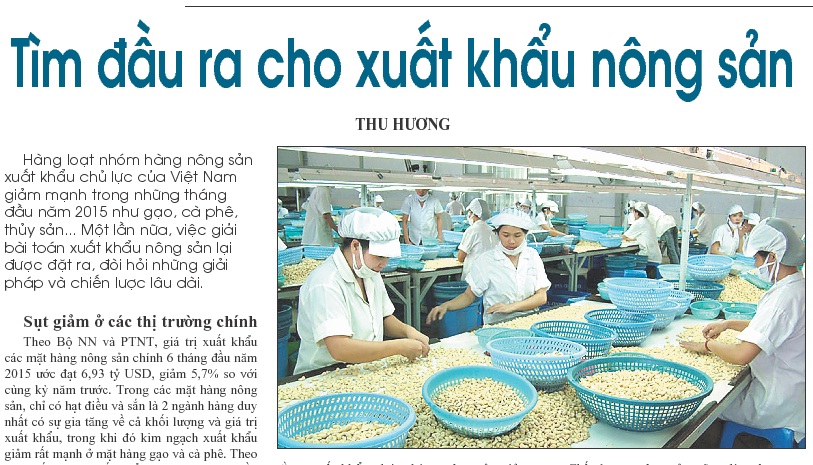 Trang 4, số 230, báo Đại biểu Nhân dân ra ngày 18/8 có bài viết đáng chú ý: “Tìm đầu ra cho xuất khẩu nông sản”. Theo đó, hàng loạt nhóm hàng nông sản xuất khẩu chủ lực của Việt Nam giảm mạnh trong những tháng đầu năm 2015 như gạo, cà phê, thủy sản, v.v... Một lần nữa, việc giải bài toán xuất khẩu nông sản lại được đặt ra, đòi hỏi những giải pháp và chiến lược lâu dài.