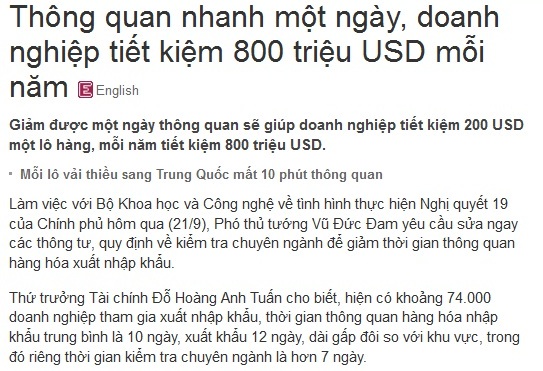 Phó Thủ tướng Vũ Đức Đam nhấn mạnh: "Giảm thời gian thông quan được một ngày thì một năm chúng ta tiết kiệm được ít nhất 800 triệu USD, bằng đúng kinh phí cấp cho ngành khoa học và công nghệ hằng năm”.