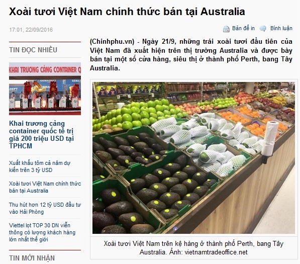 Theo bài viết, ngày 21/9, những trái xoài tươi đầu tiên của Việt Nam đã xuất hiện trên thị trường Australia và được bày bán tại một số cửa hàng, siêu thị ở thành phố Perth, bang Tây Australia.
