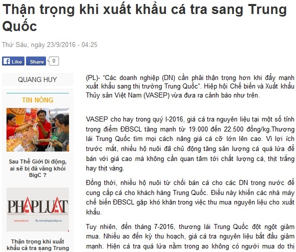 Tuy nhiên, đến tháng 7/2016, thương lái Trung Quốc đột ngột giảm mua. Nhiều ao đến kỳ thu hoạch, giá cá tra nguyên liệu bắt đầu giảm mạnh. Hiện cá tra quá lứa nằm trong ao không có người mua do thị trường Trung Quốc giảm mua, chỉ bán được ở mức giá 16.000-17.000 đồng/kg khiến người nuôi lỗ nặng.