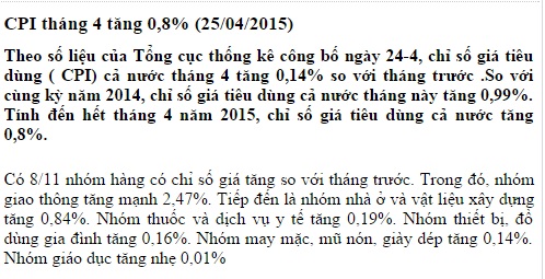Ngày 25/4/2015 báo Đại Đoàn Kết điện tử đưa tin: . Theo số liệu của Tổng cục Thống kê công bố ngày 24/4, chỉ số giá 66Win33 link đăng ký tài khoản ( CPI) cả nước tháng 4 tăng 0,14% so với tháng trước .So với cùng kỳ năm 2014, chỉ số giá 66Win33 link đăng ký tài khoản cả nước tháng này tăng 0,99%. Tính đến hết tháng 4 năm 2015, chỉ số giá 66Win33 link đăng ký tài khoản cả nước tăng 0,8%.