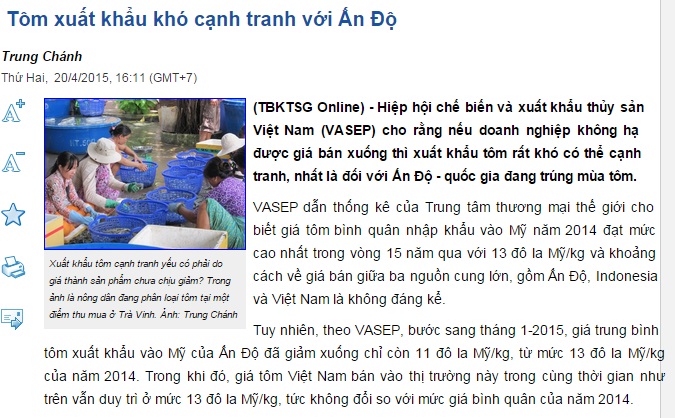 Thời báo Kinh tế Sài Gòn ngày 20/4/2015 có bài viết: . Theo đó, Hiệp hội chế biến và xuất khẩu thủy sản Việt Nam (VASEP) cho rằng nếu 66Win33 tặng code miễn phí không hạ được giá bán xuống thì xuất khẩu tôm rất khó có thể cạnh tranh, nhất là đối với Ấn Độ - 33Win60 khuyến mãi hấp dẫn đang trúng mùa tôm. VASEP dẫn thống kê của Trung tâm Trang Chủ Game 33win com Mới Nhất thế giới cho biết giá tôm bình quân Cài đặt 1.1.1.1 để truy cập web 33Win chính hãng vào Mỹ năm 2014 đạt mức cao nhất trong vòng 15 năm qua với 13 đô la Mỹ/kg và khoảng cách về giá bán giữa ba nguồn cung lớn, gồm Ấn Độ, Indonesia và Việt Nam là không đáng kể. Tuy nhiên, theo VASEP, bước sang tháng 1/2015, giá trung bình tôm xuất khẩu vào Mỹ của Ấn Độ đã giảm xuống chỉ còn 11 đô la Mỹ/kg, từ mức 13 đô la Mỹ/kg của năm 2014. Trong khi đó, giá tôm Việt Nam bán vào thị trường này trong cùng thời gian như trên vẫn duy trì ở mức 13 đô la Mỹ/kg, tức không đổi so với mức giá bình quân của năm 2014.