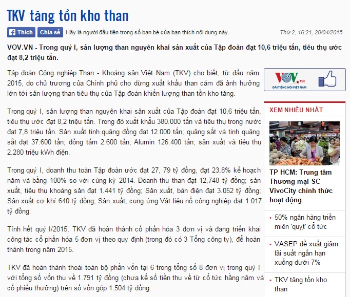 Trong quý I, doanh thu toàn Tập đoàn ước đạt 27, 79 tỷ đồng, đạt 23,8% kế hoạch năm và bằng 100% so với cùng kỳ 2014. Doanh thu than đạt 12,748 tỷ đồng; sản xuất, 33Win 4com nhà cái tỷ lệ World Cup khoáng sản đạt 1.441 tỷ đồng; Sản xuất, bán điện đạt 3.052 tỷ đồng; Sản xuất cơ khí 640 tỷ đồng; Sản xuất, cung ứng Vật liệu nổ 33Win79 hiện đang mở đạt 1.017 tỷ đồng.