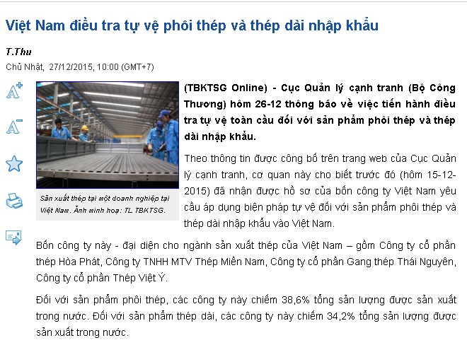 Theo thông tin được công bố trên trang web của Cục Quản lý cạnh tranh. Cơ quan này cho biết trước đó (ngày 15/12/2015) đã nhận được hồ sơ của bốn công ty Việt Nam yêu cầu áp dụng biện pháp tự vệ đối với sản phẩm phôi thép và thép dài Cài đặt 1.1.1.1 để truy cập web 33Win chính hãng vào Việt Nam.