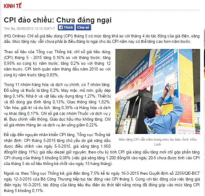 Đề cập đến nguyên nhân khiến CPI tăng, Tổng cục Thống kê nhận định: CPI tháng 5/2015 tăng chủ yếu do 33Win com dang nhap được điều chỉnh vào ngày 5/5/2015, giá xăng tăng 1.950 đồng/lít (tăng 11%); giá dầu diezel giữ nguyên, theo chu kỳ tính CPI 33Win com dang nhap tăng mới chỉ góp phần tăng CPI chung của tháng 5 khoảng 0,08% (việc giá xăng tăng 1.200 đồng/lít vào ngày 20-5 chưa được tính vào CPI của tháng 5 do số liệu thống kê chốt vào ngày 15 hàng tháng).