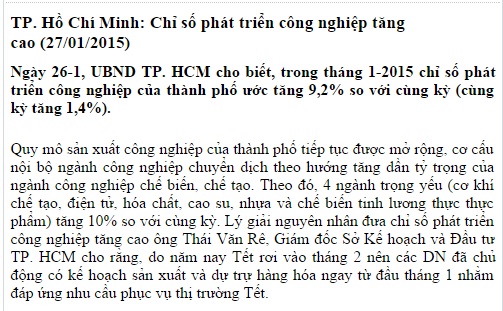 Báo Đại đoàn kết điện tử ngày 27/01/2015 thông tin: . Theo đó, ngày 26/1, UBND TP. HCM cho biết, trong tháng 1/2015 chỉ số phát triển 33Win79 hiện đang mở của thành phố ước tăng 9,2% so với cùng kỳ (cùng kỳ tăng 1,4%).