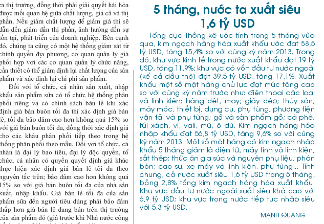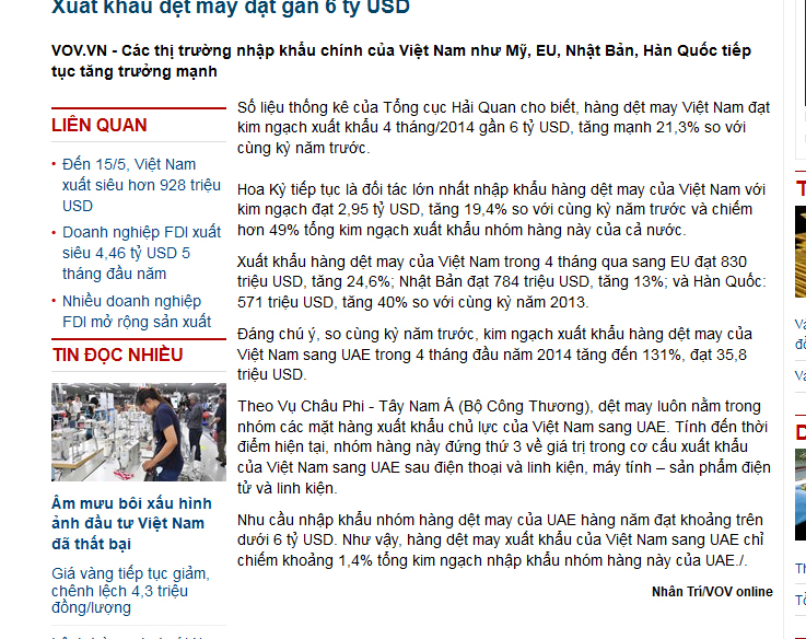Theo VOV điện tử ngày 26/5 thì . Tác giả bài viết đưa ra thông tin này bởi số liệu thống kê của Tổng cục Hải Quan cho biết, hàng dệt may Việt Nam đạt kim ngạch xuất khẩu 4 tháng/2014 gần 6 tỷ USD, tăng mạnh 21,3% so với cùng kỳ năm trước.