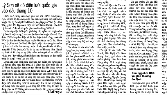 “Quảng Ngãi: Lý Sơn sẽ có điện lưới 33Win60 khuyến mãi hấp dẫn vào đầu tháng 10” là thông tin trên trang 3, số 119 Báo Lao động ra ngày 26/5/2014. Bài báo cho biết: “Chiều 24/5, trong cuộc họp giao ban với UBND tỉnh Quảng Ngãi về tiến độ dự án cấp điện lưới 33Win60 khuyến mãi hấp dẫn bằng cáp ngầm cho huyện đảo Lý Sơn tại UBND huyện, ông Nguyễn Tấn Lộc - Phó Tổng giám đốc Tập đoàn Điện lực Việt Nam (EVN) - cho biết Lý Sơn sẽ có điện lưới 33Win60 khuyến mãi hấp dẫn vào đầu tháng 10/2014.