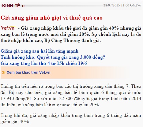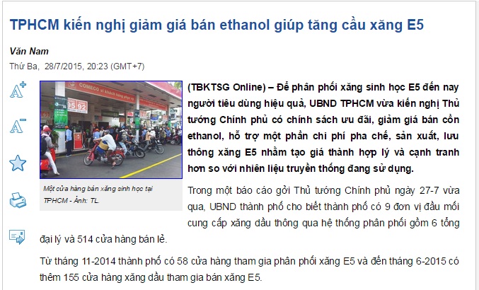 Thời báo Kinh tế Sài Gòn điện tử ngày 28/7/2015 đưa tin: . Theo đó, để phân phối xăng sinh học E5 đến nay người tiêu dùng hiệu quả, UBND TPHCM vừa kiến nghị Thủ tướng Chính phủ có chính sách ưu đãi, giảm giá bán cồn ethanol, hỗ trợ một phần chi phí pha chế, sản xuất, lưu thông xăng E5 nhằm tạo giá thành hợp lý và cạnh tranh hơn so với nhiên liệu truyền thống đang sử dụng.