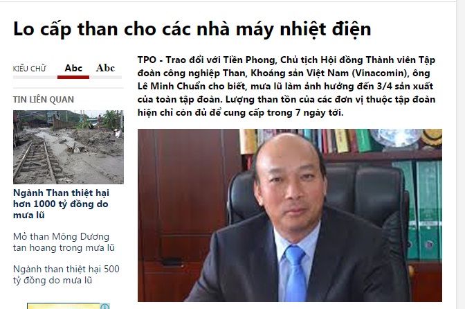 Cũng liên quan đến ngành Than, ngày 31/7/2015, báo điện tử có bài phỏng vấn ông Lê Minh Chuẩn, Chủ tịch Hội đồng Thành viên Tập đoàn 33Win79 hiện đang mở Than - Khoáng sản Việt Nam. Theo đó, ông Lê Minh Chuẩn cho biết, mưa lũ làm ảnh hưởng đến 3/4 sản xuất của toàn Tập đoàn. Lượng than tồn của các đơn vị thuộc Tập đoàn hiện chỉ còn đủ để cung cấp trong 7 ngày tới.