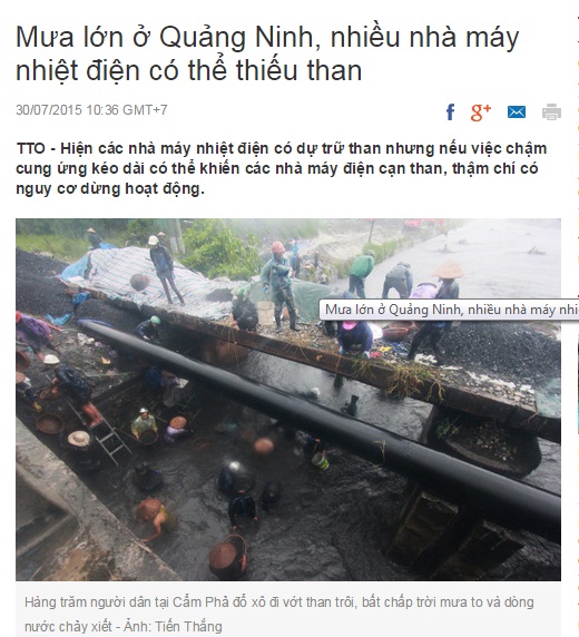 Là thông tin được đưa ra trên báo điện tử ngày 30/7/2015. Theo đó, hiện các nhà máy nhiệt điện có dự trữ than nhưng nếu việc chậm cung ứng kéo dài có thể khiến các nhà máy điện cạn than, thậm chí có nguy cơ dừng hoạt động. Trước tình hình mưa lớn tại Quảng Ninh, Tập đoàn Công nghiệp Than - Khoáng sản Viết Nam (TKV) đã có bản thông tin tình hình thiệt hại. Theo đó, tại khu vực Hòn Gai, Công ty than Hà Lầm bị sạt bờ kè dẫn đến nước tràn vào kho than làm trôi mất khoảng 7 ngàn tấn than sạch.