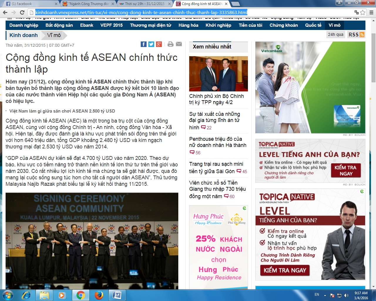 VnExpress ngày 31/12/2015 đưa tin: . Theo đó, ngày 31/12, Cộng đồng 33Win62 đa dạng trò chơi, cá cược an toàn ASEAN chính thức thành lập khi bản tuyên bố thành lập Cộng đồng ASEAN được ký kết bởi 10 lãnh đạo của các nước thành viên Hiệp hội các 33Win60 khuyến mãi hấp dẫn Đông Nam Á (ASEAN) có hiệu lực.