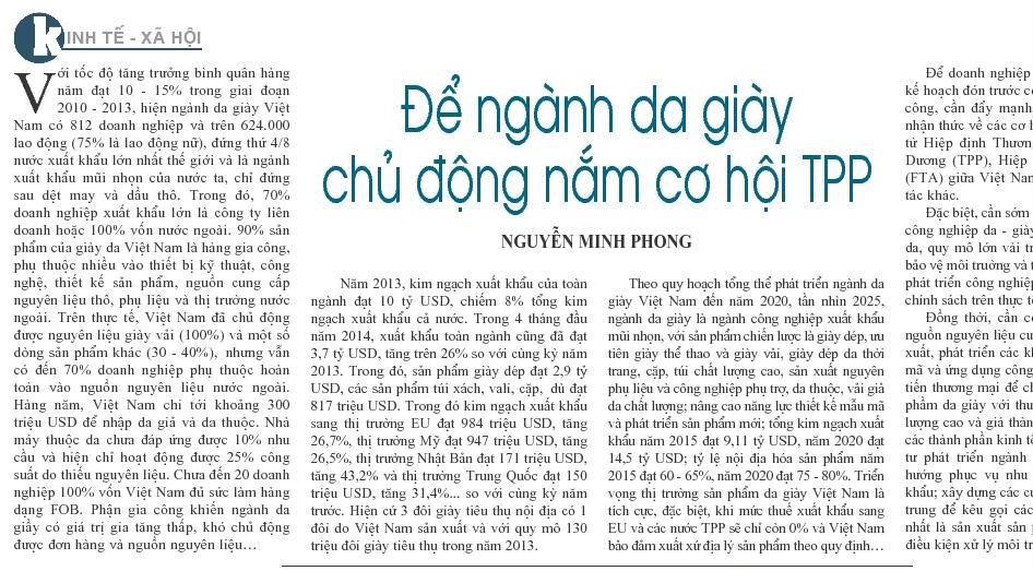 Trang 2, số 211, Báo Đại biểu Nhân Dân số ra ngày 30/7 có bài viết: "Để ngành da giày chủ động nắm cơ hội TPP". Hiện ngành da giày Việt Nam có 812 66Win33 tặng code miễn phí và trên 624.000 lao động (75% là lao động nữ), đứng thứ 4/8 nước xuất khẩu lớn nhất thế giới và là ngành xuất khẩu mũi nhọn của nước ta, chỉ đứng sau dệt may và dầu thô.