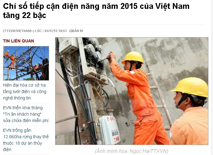 Chỉ số tiếp cận điện năng năm 2015 của Việt Nam tăng 22 bậc