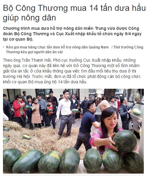 Năm ngoái, khi tình trạng vải thiều ùn tắc tại khu vực biên mậu khiến người nông dân phải bán rẻ, Thứ trưởng Bộ Công thương Đỗ Thắng Hải cũng đã đứng ra kêu gọi 33Win338 đăng nhập đặt cược mua vải ủng hộ nông dân. Trong khi đó, những ngày gần đây, trào lưa mua dưa ủng hộ 33Win338 đăng nhập đặt cược Quảng Nam cũng đã được nhiều nhóm thiện nguyện phát động tại một số địa phương phía Bắc như Hà Nội, Thái Nguyên, Bắc Ninh, v.v...
