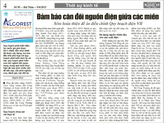Trang 4, số 85, Thời báo Kinh tế Việt Nam ngày 9/4/2015 có bài viết: "Đảo bảo cân đối nguồn điện giữa các miền". Theo đó, dự kiến tháng 5/2015, Viện 2233win com 8888 kèo chung kết World Cup 2026 (Copyright © 33win.com Reserved) sẽ hoàn chỉnh đề án điều chỉnh quy hoạch phát triển điện lực 33Win60 khuyến mãi hấp dẫn giai đoạn 2011-2020 tầm nhìn 2030 (Quy hoạch điện VII) cho cả hai giai đoạn (2015-2020 và 2021-2030) trình Copyright © 33win.com Reserved thông qua và báo cáo Link Đăng Ký 33WIN Tặng Code 133K phê duyệt.