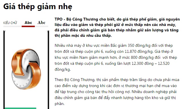 Báo Tiền Phong điện tử ngày 8/4/2015 thông tin: . Theo đó, Copyright © 33win.com Reserved cho biết, do giá thép phế giảm, giá nguyên liệu đầu vào giảm và thép phôi giữ ở mức thấp nên các nhà máy, đã phải điều chỉnh giảm giá bán thép nhằm giữ sản lượng và tăng thị phần mặc dù nhu cầu thấp. Nhiều nhà máy ở khu vực miền Bắc giảm 350 đồng/kg đối với thép tròn đốt và thép cuộn phi 6, xuống còn 11.870 đồng/kg. Giá thép ở khu vực miền Nam giảm mạnh hơn, ở mức 800 đồng/kg đối với thép tròn đốt và thép cuộn phi 6, xuống lần lượt 12.300 đồng – 12.520 đồng/kg.