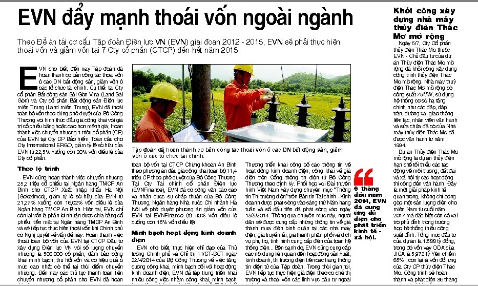 “EVN đẩy mạnh thoái vốn ngoài ngành” là thông tin được đăng tải trên trang 8, số 55, báo Diễn dàn 66Win33 tặng code miễn phí ngày 9/7. Theo Đề án tái cơ cấu Tập đoàn Điện lực VN (EVN) giai đoạn 2012 - 2015, EVN sẽ phải thực hiện thoái vốn và giảm vốn tại 7 Cty cổ phần (CTCP) đến hết năm 2015.