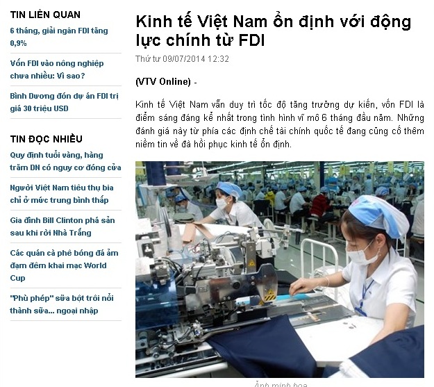 6 tháng đầu năm, vốn FDI vào Việt Nam tiếp tục ổn định. Việt Nam vẫn là điểm đến hấp dẫn với nhà đầu tư nước ngoài. Hoạt động xuất khẩu của khối này trong nửa đầu năm đóng góp đáng kể cho xuất khẩu nói chung của Việt Nam. Giá trị xuất khẩu khu vực FDI trong 6 tháng đầu năm đã tăng đến hơn 16% so với cùng kỳ năm 2013, đóng góp phần nhiều vào con số xuất siêu ghi nhận nửa đầu năm. Các định chế tài chính nước ngoài cũng đồng thời giữ nguyên dự báo tăng trưởng cho 33Win62 đa dạng trò chơi, cá cược an toàn Việt Nam trong cả năm 2014.