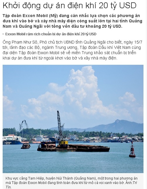VnExpress ngày 11/7 thông tin: . Theo đó, Tập đoàn Exxon Mobil (Mỹ) đang cân nhắc lựa chọn các phương án đưa khí vào bờ và xây nhà máy điện công suất lớn tại hai tỉnh Quảng Nam và Quảng Ngãi với tổng vốn đầu tư khoảng 20 tỷ USD.