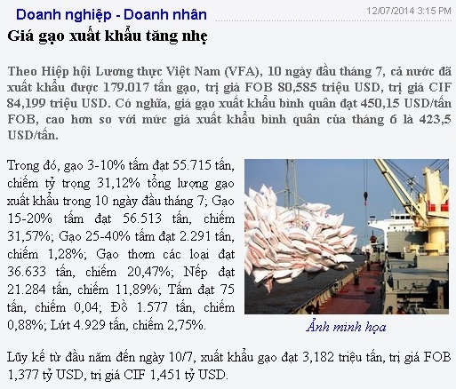 Lũy kế từ đầu năm đến ngày 10/7, xuất khẩu gạo đạt 3,182 triệu tấn, trị giá FOB 1,377 tỷ USD, trị giá CIF 1,451 tỷ USD. Cùng với giá gạo xuất khẩu, giá lúa gạo trong nước cũng nhích nhẹ. Cụ thể, theo VFA, trong tuần đến ngày 10/7, giá lúa khô tại kho khu vực ĐBSCL loại thường dao động từ 5.450 – 5.550 đồng/kg, tăng 50 đồng/kg so với tuần trước đó; lúa dài khoảng 5.650 – 5.750 đồng/kg, tăng 150 đồng/kg.