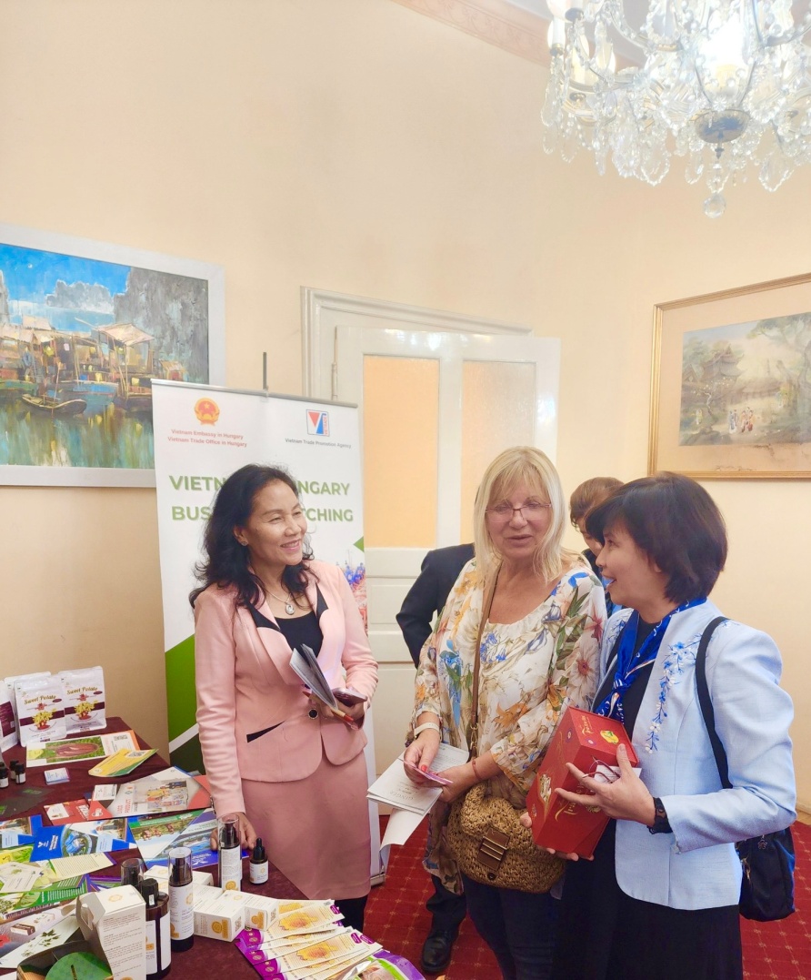 Đại sứ Việt Nam tại Hungary – bà Nguyễn Thị Bích Thảo bên gian hàng trưng bày sản phẩm Việt Nam