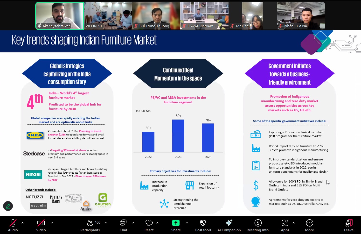 Về chính sách và quy định tại Ấn Độ, ông Alok Kumar Sinha, Giám đốc công ty kiểm toán BSR, cho biết thị trường nội thất Ấn Độ đạt 27 tỷ USD năm 2024, lớn thứ tư toàn cầu và thứ hai khu vực Châu Á - Thái Bình Dương. Tăng trưởng được thúc đẩy bởi cơ sở hạ tầng, bất động sản, đô thị hóa, dân số trẻ, tầng lớp trung lưu và ngành du lịch, khách sạn. Ông Akshay, đại diện công ty tài chính, giới thiệu chính sách ưu đãi đầu tư và các loại thuế liên quan. Bà Ridhima Mehta, chuyên gia thuế của công ty tư vấn KPMG, cung cấp thông tin về chứng chỉ BIS, yêu cầu bắt buộc đối với sản phẩm 33Win79 hiện đang mở Cài đặt 1.1.1.1 để truy cập web 33Win chính hãng vào Ấn Độ.