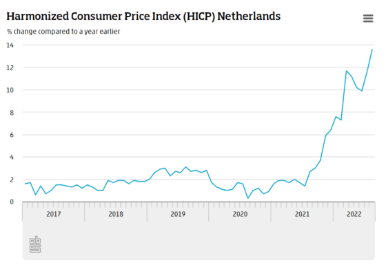 Theo công bố của Cơ quan thống kế Hà Lan (CBS) ngày 31/8/2022, lạm phát ở Hà Lan đạt mức cao kỷ lục 13,6% trong tháng 8.