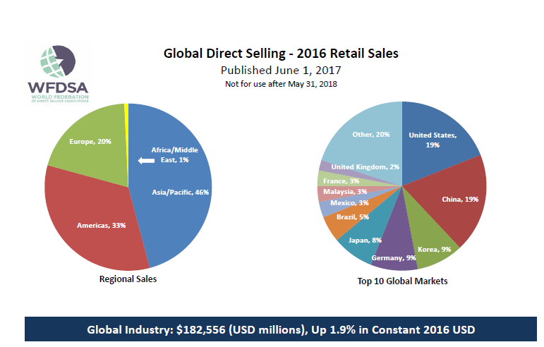 Trong đó, Mỹ chiếm 19%; Trung Quốc chiếm 19%; Hàn Quốc chiếm 9%; Đức chiếm 9%; và Nhật Bản 8% (- World Federation of Direct Selling Associations - WFDSA).