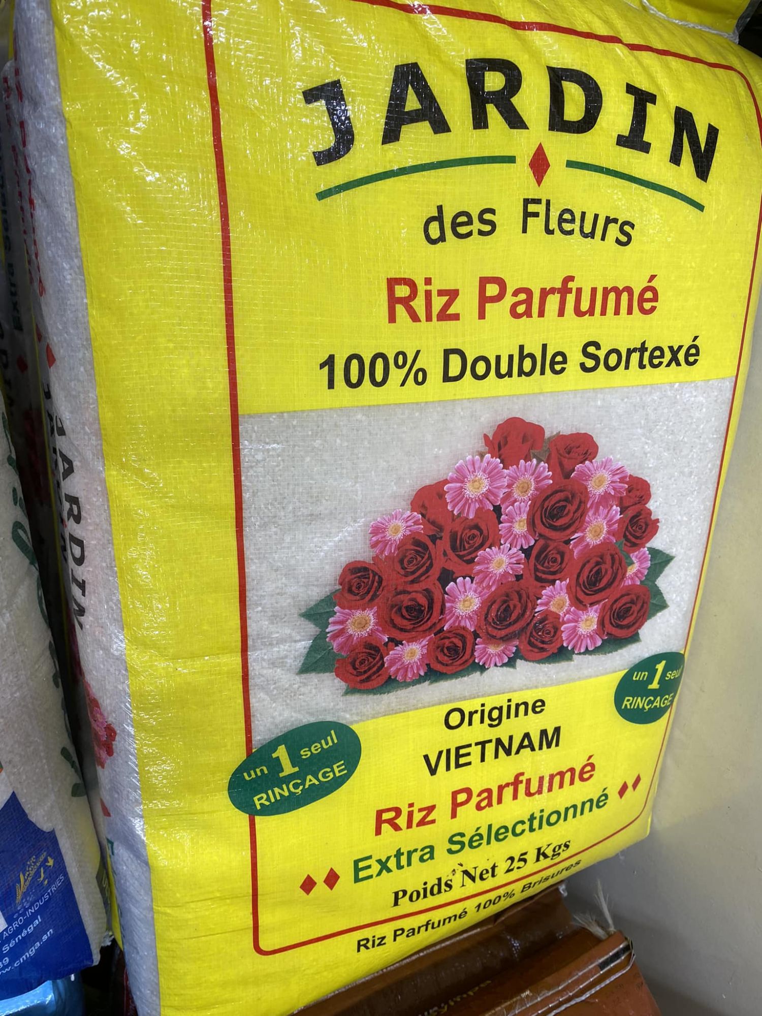 Gạo thơm Việt Nam 100% tấm được bán trong các bao 25 kg tại các siêu thị ở Senegal