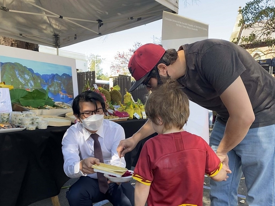 Trưởng Cơ quan Thương vụ Việt Nam mời các bạn trẻ Úc dùng thanh long trong sự kiện tháng 9/2021 (Trước đó trong tháng 7, Thương vụ đã tổ chức tuần lễ thanh long Việt Nam)