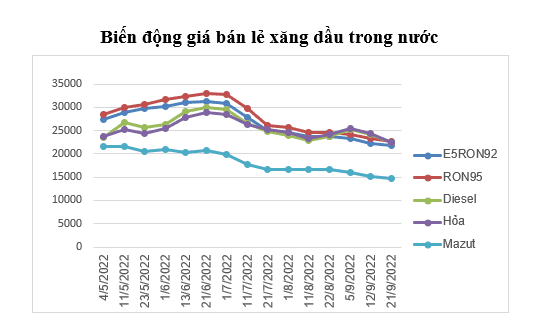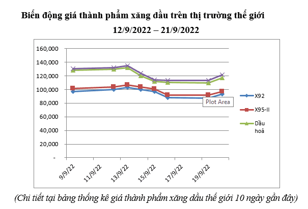 Bình quân giá thành phẩm xăng dầu thế giới giữa 02 kỳ điều hành giá ngày 12/9/2022 và ngày 21/9/2022 là: 95,296 USD/thùng xăng RON92 dùng để pha chế xăng E5RON92 (giảm 2,924 USD/thùng, tương đương giảm 2,977% so với kỳ trước); 99,376 USD/thùng xăng RON95 (giảm 3,706 USD/thùng, tương đương giảm 3,595% so với kỳ trước); 118,579 USD/thùng dầu hỏa (giảm 13,193 USD/thùng, tương đương giảm 10,012% so với kỳ trước); 121,851 USD/thùng dầu điêzen (giảm 11,831 USD/thùng, tương đương giảm 8,850% so với kỳ trước); 420,980 USD/tấn dầu mazut 180CST 3,5S (giảm 15,522 USD/tấn, tương đương giảm 3,556% so với kỳ trước).