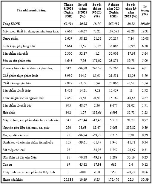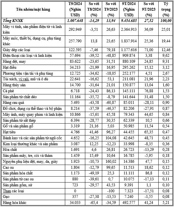 trong tháng 9/2024 và 9 tháng đầu năm 2024