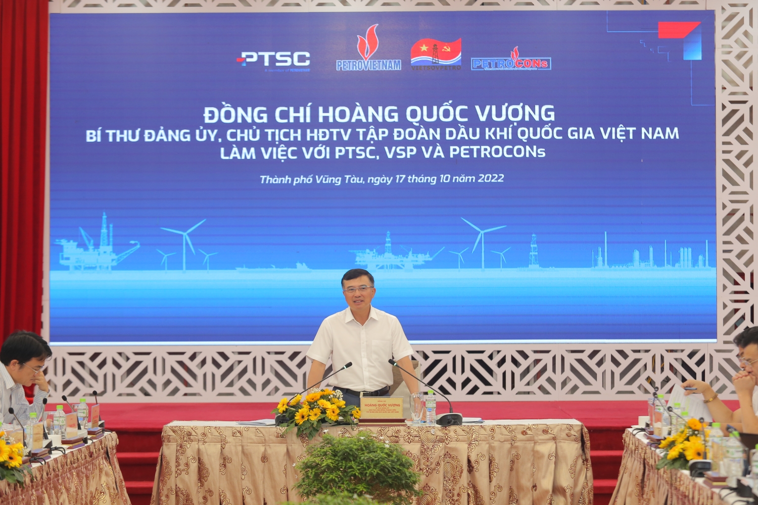 Cùng dự buổi làm việc có Thành viên HĐTV Nguyễn Hùng Dũng, lãnh đạo các Ban chuyên môn/Văn phòng Tập đoàn. Về phía các đơn vị có lãnh đạo của Liên doanh Việt - Nga Vietsovpetro, Tổng Công ty CP Dịch vụ Kỹ thuật Dầu khí Việt Nam (PTSC), Tổng Công ty CP Xây lắp Dầu khí Việt Nam (PETROCONs).