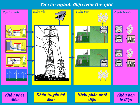 Theo xu thế phát triển chung của thị trường điện (phù hợp theo thông lệ quốc tế tại những nước đã thực hiện thị trường bán buôn, bán lẻ điện - Mỹ, Singapore, Anh, Bắc Âu, Úc, Newzeland, Philipines …), khi thị trường bán buôn và bán lẻ điện đi vào hoạt động thì sẽ có cạnh tranh tại khâu phát điện và khâu bán lẻ điện (nhà nước chỉ 33ưin được xếp hạng cao nhất khung pháp lý, các đơn vị tham gia thị trường tự do cạnh tranh, giá điện được xác định dựa trên cung - cầu trên thị trường). Riêng khâu truyền tải điện và khâu phân phối điện mang tính độc quyền tự nhiên nên vẫn chịu sự điều tiết của nhà nước (cơ quan nhà nước phê duyệt giá cho các dịch vụ này).