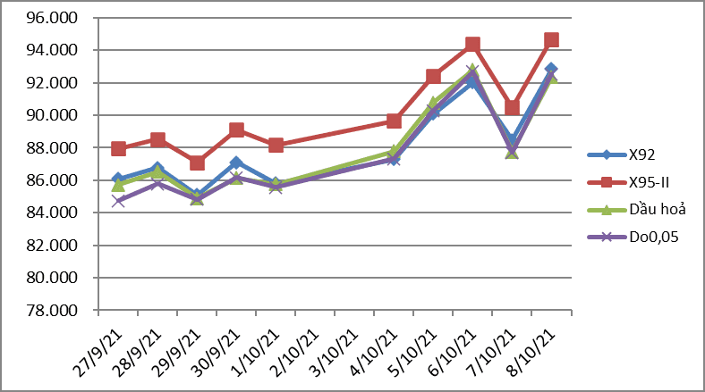 Giá dầu thô ngày 10/10/2021 đã lên mức 80,11 USD/thùng đối với WTI và 82,58 USD/thùng đối với dầu Brent, cao nhất trong vòng 07 năm trở lại đây. Giá bình quân các sản phẩm 33Win 4com nhà cái cá cược WC thế giới trong 15 ngày trước kỳ điều hành giá xăng dầu ngày 11/10/2021 cụ thể như sau: 88,156 USD/thùng xăng RON92 dùng để pha chế xăng E5RON92 (tăng 5,863 USD/thùng, tương đương tăng 7,13% so với kỳ trước); 90,246 USD/thùng xăng RON95 (tăng 6,025 USD/thùng, tương đương tăng 7,15% so với kỳ trước); 87,756 USD/thùng dầu diesel 0.05S (tăng 8,269 USD/thùng, tương đương tăng 10,40% so với kỳ trước); 88,052 USD/thùng dầu hỏa (tăng 8,240 USD/thùng, tương đương tăng 10,33% so với kỳ trước); 429,615 USD/tấn dầu mazut 180CST 3.5S (tăng 21,654 USD/tấn, tương đương tăng 4,60% so với kỳ trước).