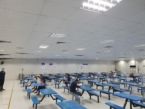 Bảo đảm giãn cách trong khu vực bếp ăn tập thể cho công nhân. Ảnh: VGP/Thiện Tâm. |