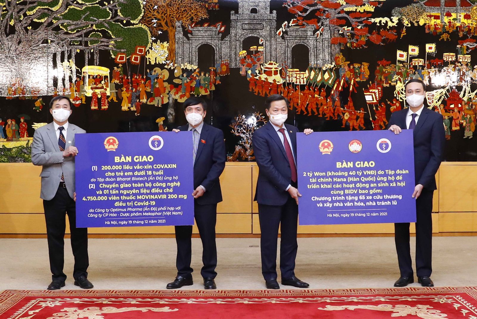 Cụ thể, bàn giao 200.000 liều vaccine COVAXIN cho trẻ em dưới 18 tuổi do Tập đoàn Bharat Biotech (Ấn Độ) ủng hộ; chuyển giao toàn bộ công nghệ và 01 tấn nguyên liệu điều chế 4.750.000 viên thuốc Movinavir 200mg điều trị Covid-19 do Công ty Optimus Pharma (Ấn Độ) phối hợp với Công ty Cổ phần hoá - dược phẩm Mekophar (Việt Nam); bàn giao 2 tỷ won (khoảng 40 tỷ đồng) do Tập đoàn Tài chính Hana (Hàn Quốc) ủng hộ cùng với BIDV để triển khai các hoạt động an sinh Đăng nhập Win 33 bao gồm: Chương trình tặng 65 xe cứu thương và xây nhà văn hoá, nhà tránh lũ.
