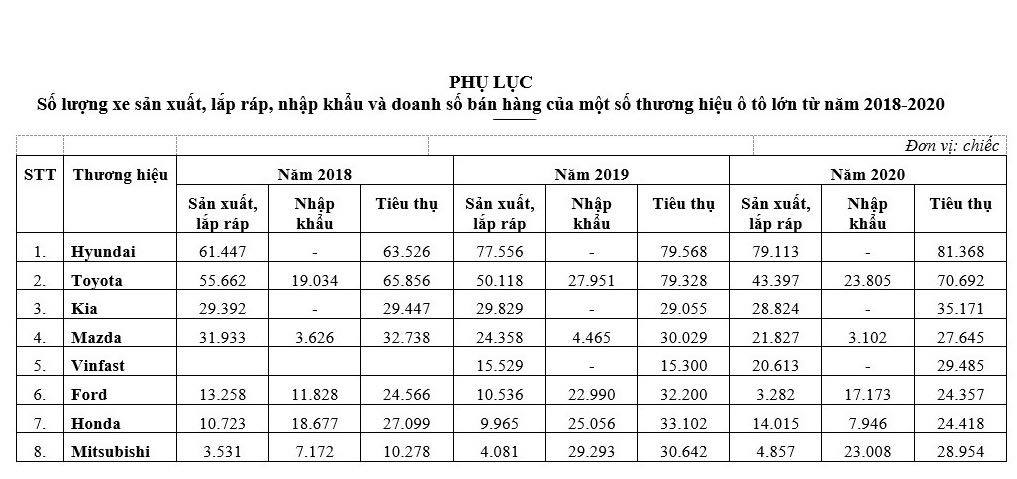 Theo số liệu của Cục Đăng kiểm Việt Nam, sản lượng ô tô sản xuất, lắp ráp trong nước từ 2018 đến nay như sau: Năm 2018, số lượng xe sản xuất lắp ráp trong nước đạt 287.586 xe; Năm 2019, số lượng xe sản xuất lắp ráp trong nước là 339.151 và Năm 2020, số lượng xe sản xuất lắp ráp trong nước là 323.892. (Ghi chú: số liệu bao gồm cả loại hình xe được sản xuất, lắp ráp từ linh kiện rời và loại hình xe được sản xuất, lắp ráp từ xe sát xi cơ sở hoặc xe mới khác đã được chứng nhận).
