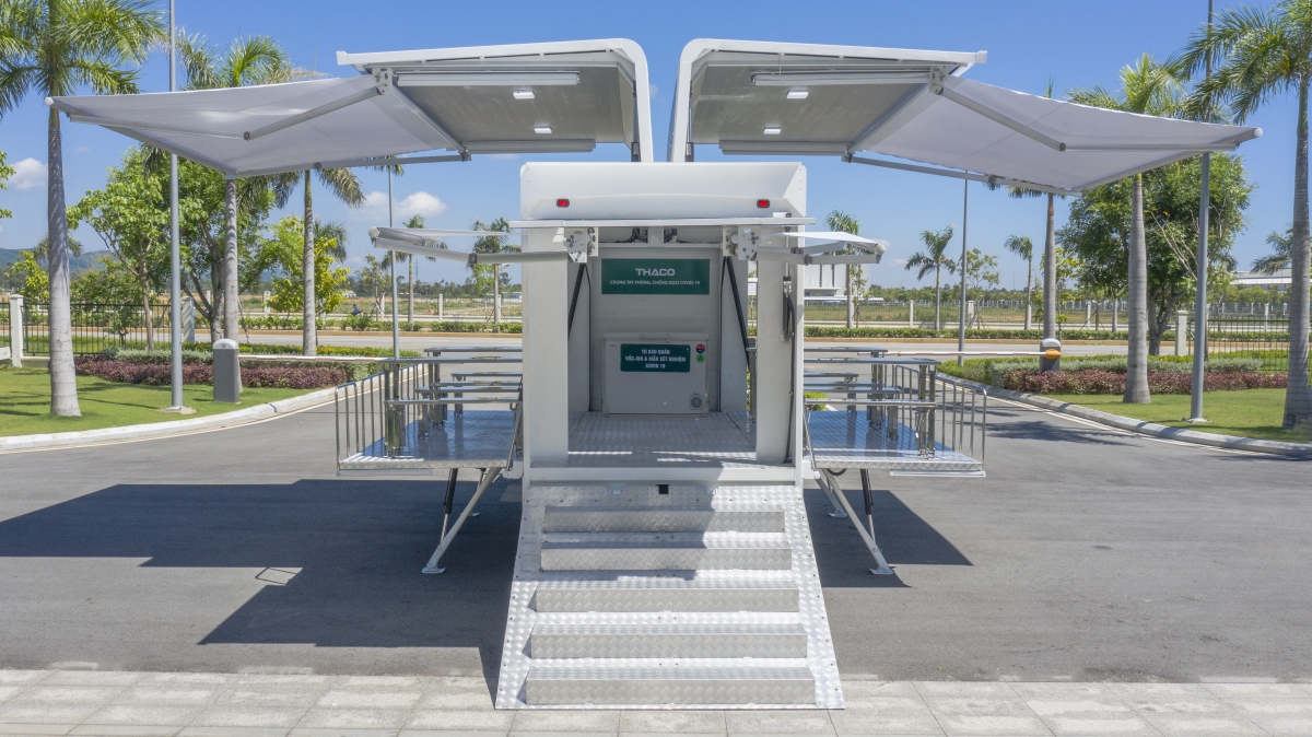 Hai mảng hông phụ thu gọn trong lòng thùng xe sẽ bung ra, kết hợp với sàn chính tạo thành không gian rộng rãi để bố trí bàn ghế phục vụ khám sàng lọc và tiêm chủng. 4 chân chống được điều khiển hạ xuống tạo thành chân đỡ chắc chắn cho sàn phụ. 2 bạt cuốn tự động được kéo ra từ các mái che giúp tăng diện tích che mát, đồng thời rèm che được thả xuống.